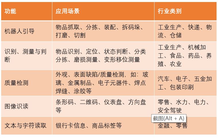 工业应用主要分为机器人三维引导和工业在线检测两大块。机器人三维引导指通过三维位姿计算技术,实现机器人精确定位及引导,完成抓取、装配等操作,给产线柔性升级。工业在线检测指通过机器视觉,实现缺陷检测、组件校验、质量控制等功能,替代人工,具有检测速度快,准确率高、重复性好等特点。